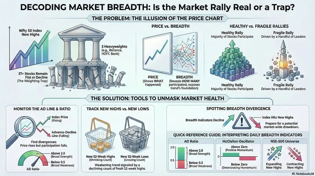 The Nifty 50 makes a new all-time high. Traders are celebrating. Everyone is bullish. But here's what nobody mentions: of the 50 stocks in the index, 37 are actually flat or declining that day. The index is being lifted by 3 heavyweight stocks — Reliance, HDFC Bank, TCS — that have massive index weightings. The broad market is not participating. The rally has no foundation.