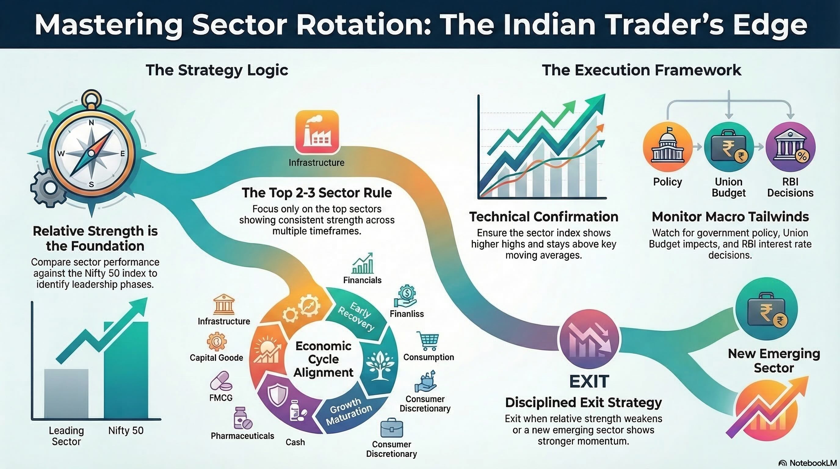In India, sector rotation is often accelerated by government policy, the Union Budget, RBI rate decisions, and global commodity prices. Understanding geopolitical and macro factors that benefit specific sectors gives you a significant edge in anticipating rotation before it shows up fully in price.