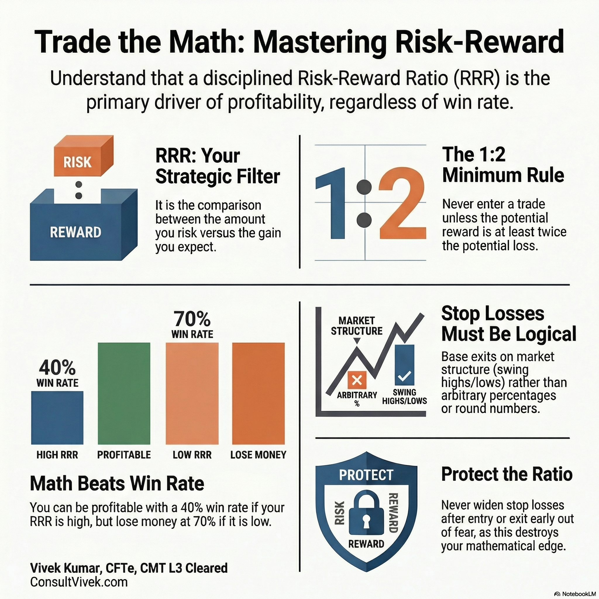 The concept of risk reward ratio has its roots in the fundamental principles of financial risk management, tracing back to the early days of organised commodity and equity markets in the 19th century. At its core, risk reward ratio — also referred to as risk-to-reward ratio, R multiple, or trade expectancy ratio — describes the mathematical relationship between the maximum potential loss and the maximum potential gain on any given trade or investment position. The formalisation of how to calculate risk reward ratio as a professional trading discipline gained significant momentum in the mid-20th century. Ed Seykota, a pioneer of systematic trend following, and later Van Tharp — through his groundbreaking work on expectancy, R multiples, and position sizing — helped codify risk reward ratio as a measurable, mathematical cornerstone of professional trading methodology. Tharp's research demonstrated that position sizing and expectancy — of which risk reward ratio is a primary component — account for a far greater proportion of performance variability between traders than entry signal selection alone. In the Indian context, the importance of risk reward ratio in trading has grown with the explosive increase in retail participation in equity and derivatives markets. The National Stock Exchange and the Bombay Stock Exchange together attract tens of millions of retail participants, many of whom enter with limited understanding of how to calculate risk reward ratio systematically. This knowledge gap has contributed to persistent statistics showing that a significant majority of retail traders in India experience net losses within their first year of active participation. The correct application of risk reward ratio requires three clearly defined inputs: a structurally valid entry price, a chart-based stop loss that is triggered only when the trade's premise is genuinely invalidated, and a logically justified profit target anchored to the next significant area of supply or demand. Without all three, risk reward ratio cannot be meaningfully calculated or disciplined applied. Modern professional application of how to calculate risk reward ratio has moved beyond simple ratio mathematics toward integrated expectancy frameworks. CMT curriculum materials at all three levels include the study of expectancy, risk management, and the mathematical relationship between win rate and risk reward ratio as core competencies. For Indian retail traders operating across Nifty, Bank Nifty, midcap equities, and sector ETFs, calculating risk reward ratio before every trade provides the primary filter that distinguishes disciplined, process-driven trading from reactive, hope-driven speculation.